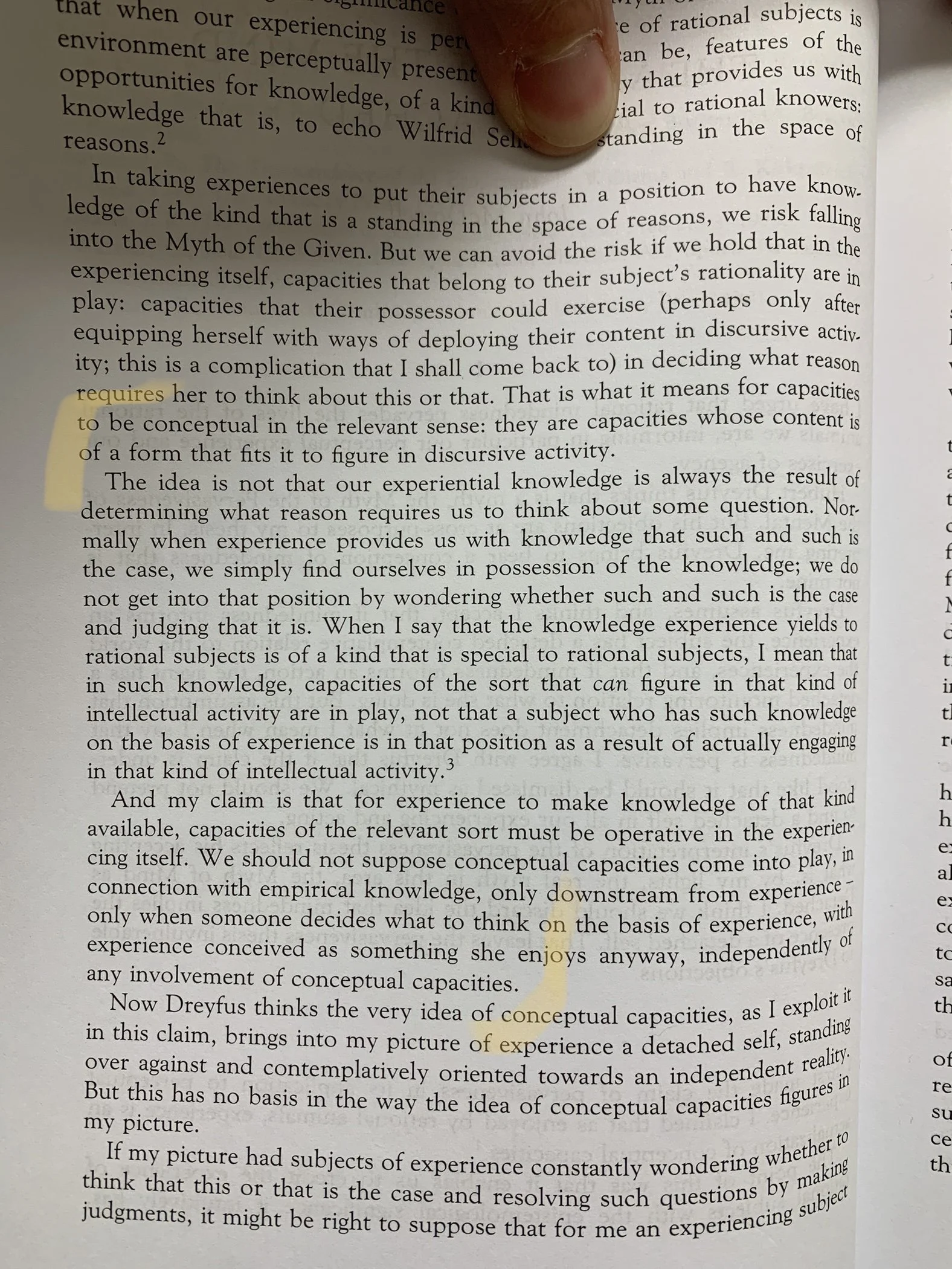 What is McDowell saying here? Is he referring to the objects of concepts, before they are deliberated on, that grounds our thinking with perception?